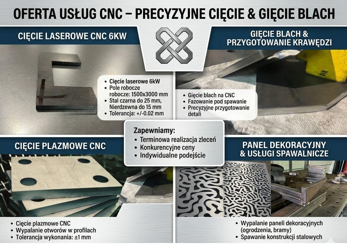 – Spawanie elementów stalowych i aluminiowych- Precyzja: Dzięki technologii CNC możliwe jest uzyskanie wysokiej precyzji cięcia, nawet przy dużych seriach produkcyjnych.